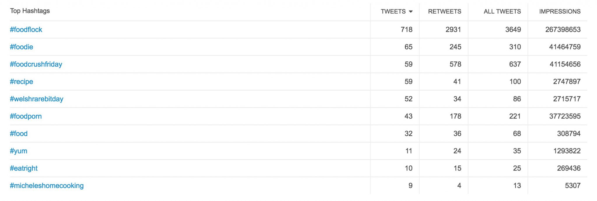 Aquí tienes una lista de aquellos hashtags que también se están utilizando junto con el principal, así como su impacto en impresiones.