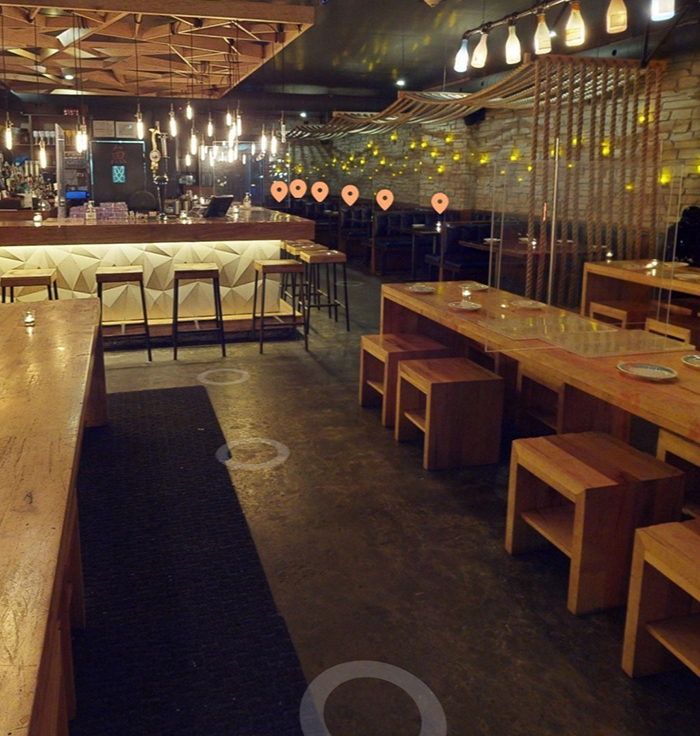 En la esquina inferior izquierda hay un menú con cuatro opciones. La primera de ella es el sistema de reproducción, que muestra un tour del local en pantalla. Al lado, una opción permite cambiar entre la vista en primera persona y una tercera persona en perspectiva isométrica con transparencias. El modelo es mejorable, pero da una magnífica idea general de la configuración del restaurante. La vista en planta también es imperfecta, mas de nuevo ayuda a ubicarse. Finalmente, para los visitantes más quisquillosos, una herramienta de medida —representada por una regla— permite estimar las distancias entre los diferentes elementos del establecimiento.